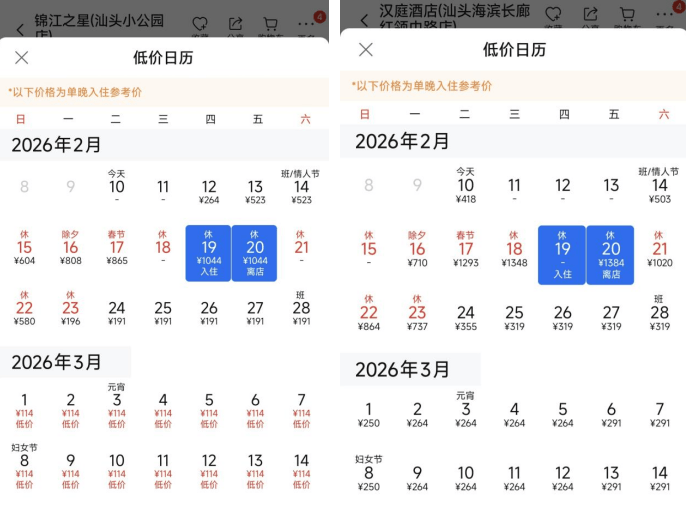 今年春节假期,返乡游与民俗游火热。而潮汕地区的英歌舞、舞龙醒狮等非遗民俗和潮汕美食,以及汕头迎新大型焰火晚会等活动,吸引众多游客奔赴感受年味。此前,有旅游平台发布数据显示,汕头、揭阳、潮州领跑春节假期国内黑马目的地前十榜单,旅游订单增速分别高达186%、162%、135%。另有行业机构在2月初监测统计发现,春节假期,广东(潮州、汕头)、福建(泉州、福州)、云南(西双版纳、普洱)的酒店价格水平领跑全国,较平日涨幅多在100%~250%区间。南都记者搜索发现,不仅是汕头,潮州、揭阳也有酒店春节期间价格翻数倍。